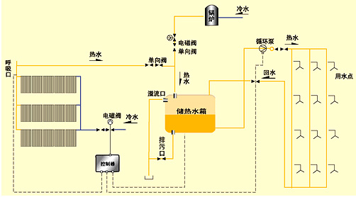 工作原理:在光照條件下將太陽能集熱器采集的熱量儲存并加熱水(或其他介質)使之溫度升高,再將含有高能量的水或介質送入儲熱容器內(水箱)。光照不足或無光照條件下用常規能源補償。